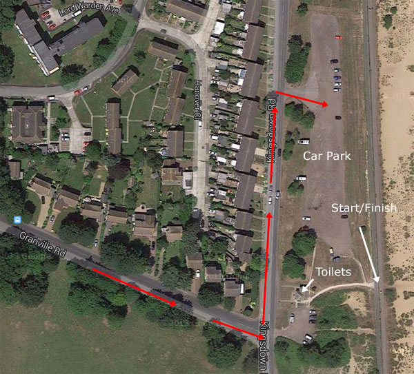 There is a large free car park a few yards from the start/finish. Kingsdown Road, Walmer, Kent, CT14 7LH - the car park opens at 0700. There are actually three car parks very close together, the sat nav will likely bring you out at Granville St, turn left and park in the main car park, please park in the big car park as the local dog walkers like to use the little ones.